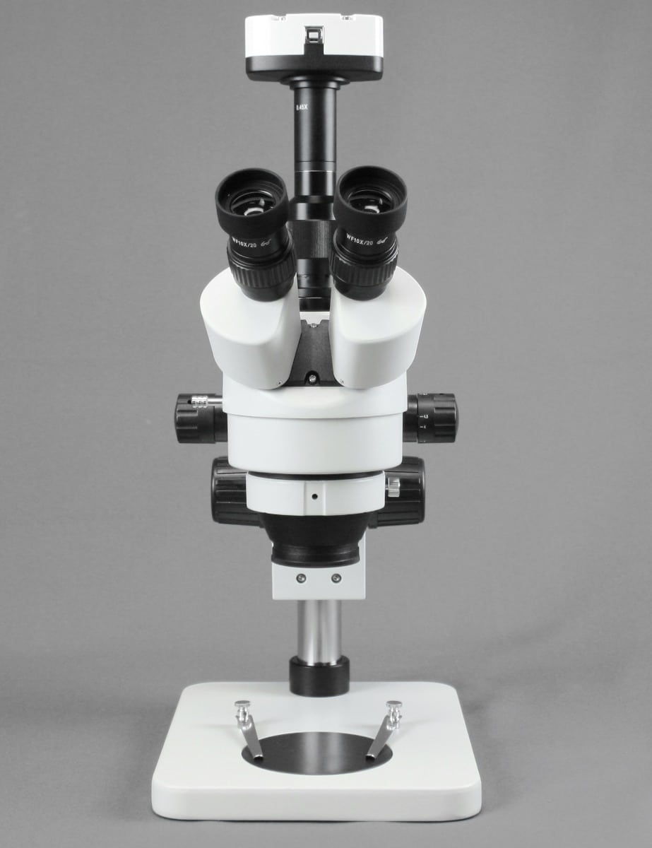 This trinocular zoom stereo microscope is ideal for laboratory, industrial or medical applications. Using its high resolution, great depth, and a large field of view, it is the perfect instrument for viewing any three-dimensional or temperature-sensitive specimen or object. Features a simul-focal trinocular head which means the photo port and both eyepieces can be used simultaneously. The compact, thin design of the base provides added comfort for the user and allows sample positions to remain low, which provides easy accessibility to variable light controls. The pillar stand provides a long working distance, to offer maximum flexibility when working with small or large samples. Rugged cast aluminum with gray enamel finish. Packed in a fitted Styrofoam box and includes a dust cover and an instruction manual. 5-year limited warranty.