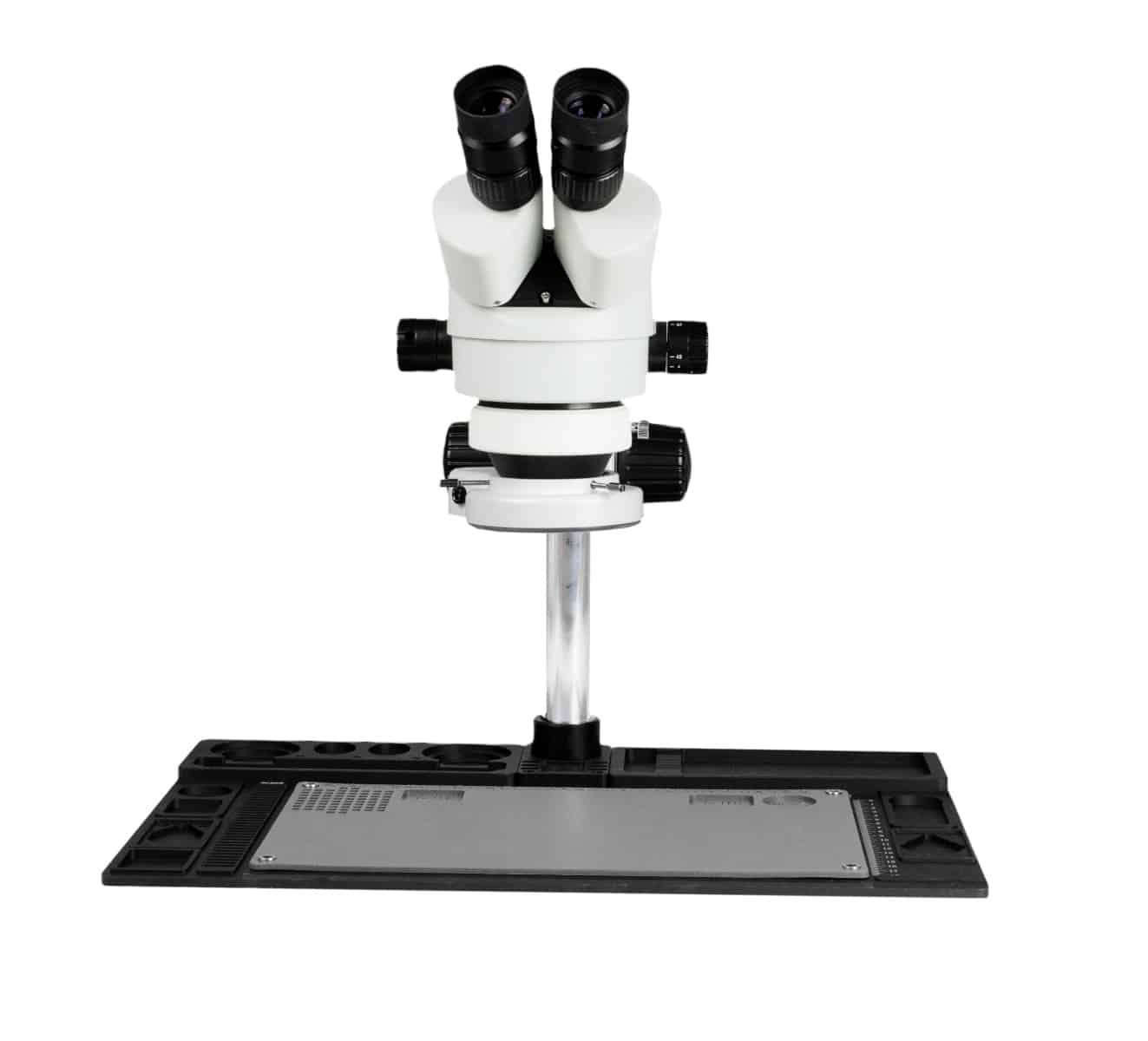 This binocular zoom stereo microscope is ideal for electronic and industrial applications. Using its high resolution, great depth, and a large field of view, it is the perfect instrument for viewing any three-dimensional specimen or object. The base is made of aluminum alloy to give a durable and stable work space and it has multiple slots for tools and materials. The platform base includes an insulated silicon pad for anti-static repair and maintenance. The silicon pad is resistant to high temperatures up to 500°C and anti-corrosive. The pad is also easy to remove and clean. This maintenance platform creates a perfect working environment for small electronics such as circuit boards and for devices such as mobile phones. Packed in a fitted Styrofoam box and includes a dust cover and an instruction manual. 5-year limited warranty.