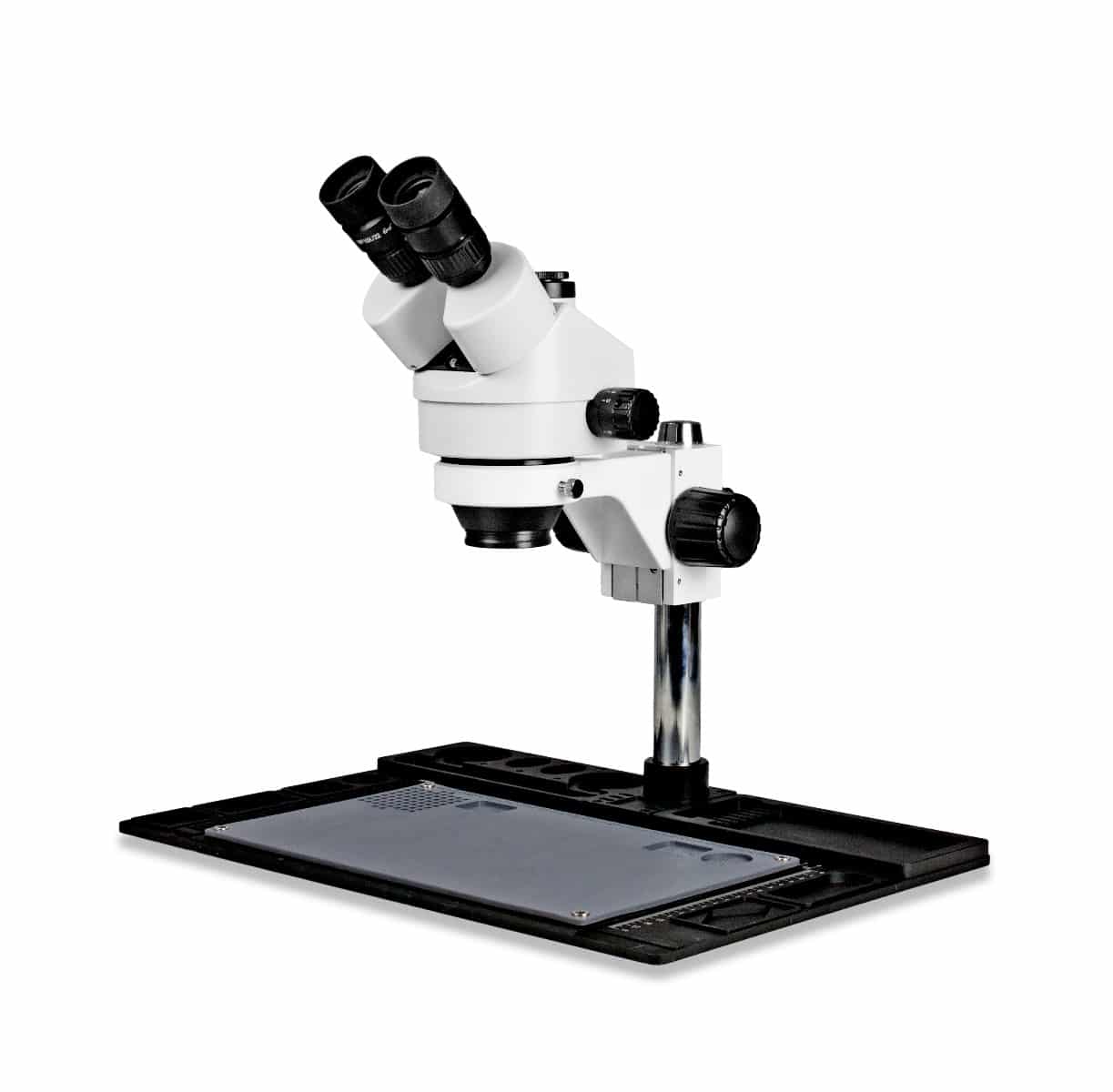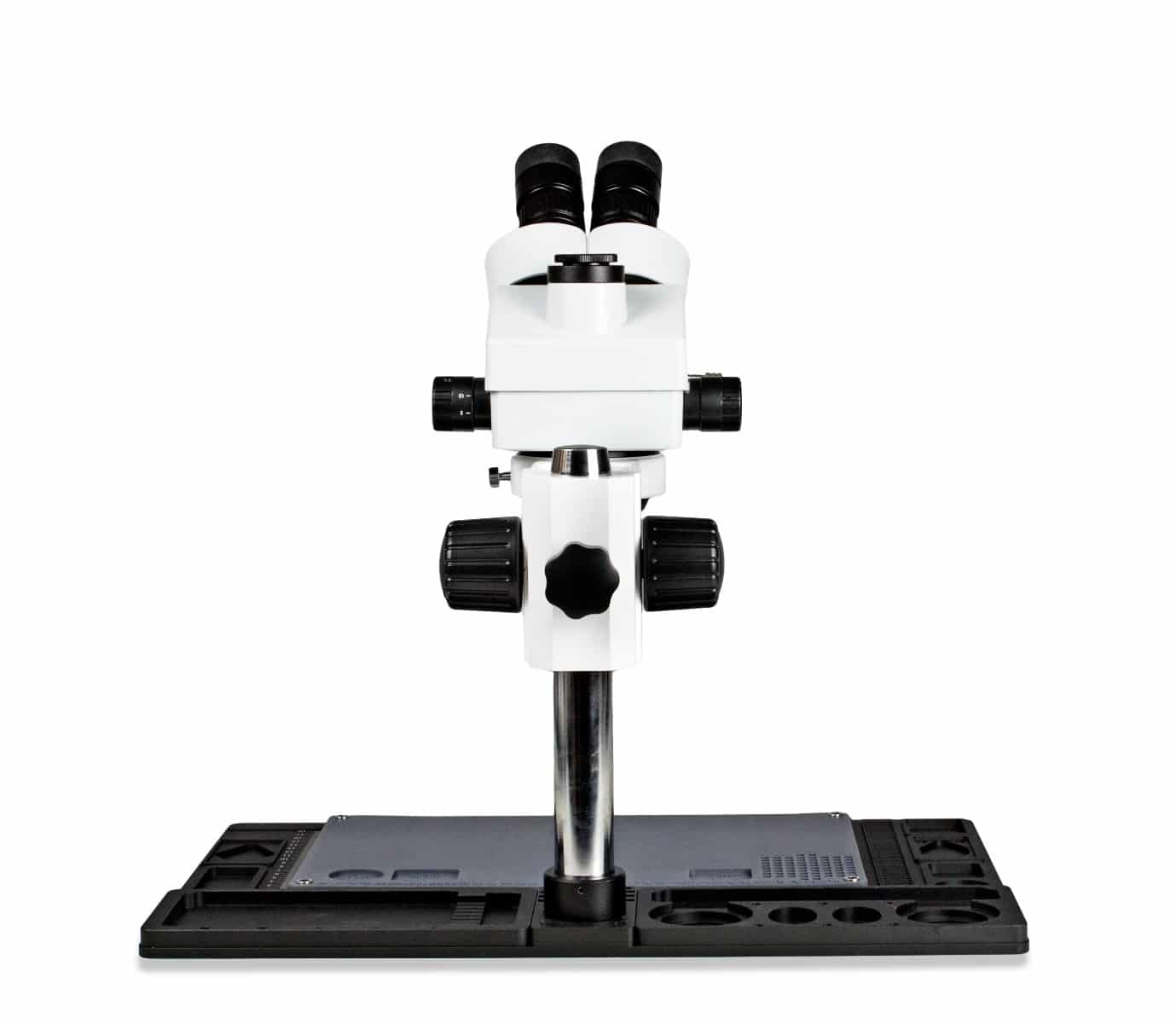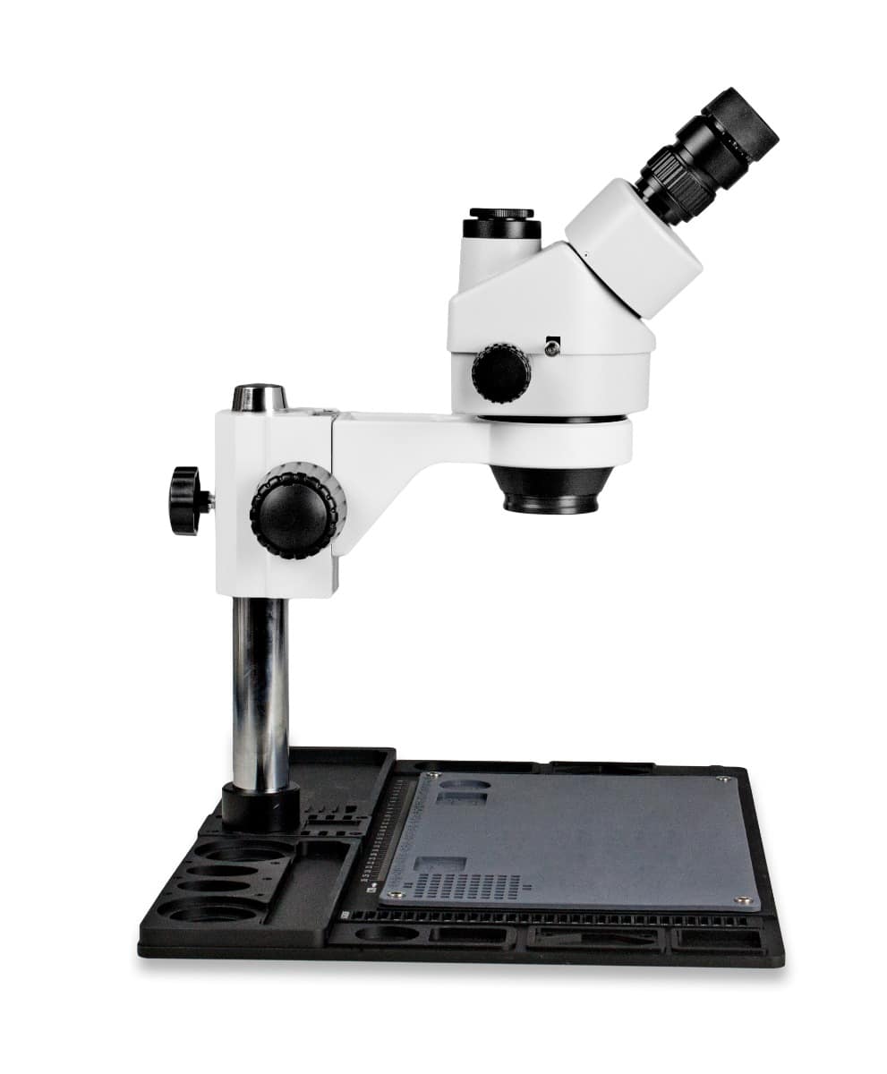This trinocular zoom stereo microscope is ideal for electronic and industrial applications. Using its high resolution, great depth, and a large field of view, it is the perfect instrument for viewing any three-dimensional specimen or object. Features a simul-focal trinocular head which means the photo port and both eyepieces can be used simultaneously.