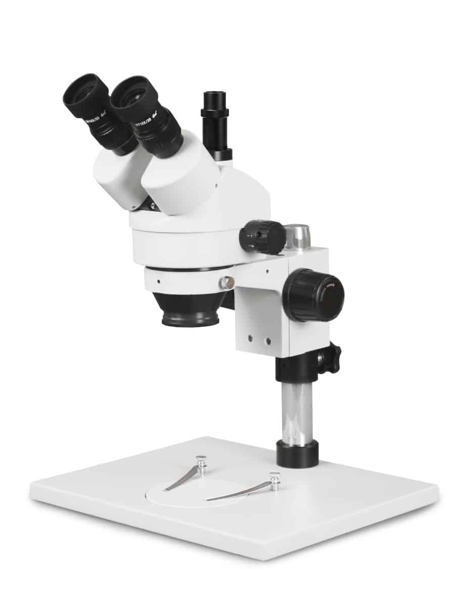 This trinocular zoom stereo microscope is ideal for laboratory, industrial or medical applications. Using its high resolution, great depth, and a large field of view, it is the perfect instrument for viewing any three-dimensional or temperature-sensitive specimen or object. Features a simul-focal trinocular head which means the photo port and both eyepieces can be used simultaneously.