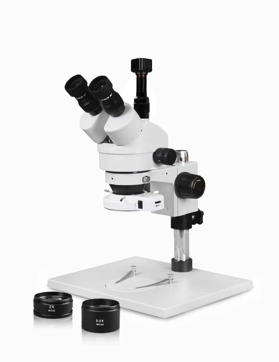 This trinocular zoom stereo microscope is ideal for laboratory, industrial or medical applications. Using its high resolution, great depth, and a large field of view, it is the perfect instrument for viewing any three-dimensional or temperature-sensitive specimen or object. Features a simul-focal trinocular head which means the photo port and both eyepieces can be used simultaneously. The compact, thin design of the large base provides added comfort for the user and allows sample positions to remain low, which provides easy accessibility to variable light controls. The pillar stand provides a long working distance, to offer maximum flexibility when working with small or large samples. Rugged cast aluminum with gray enamel finish. Packed in a fitted Styrofoam box and includes a dust cover and an instruction manual. 5-year limited warranty.