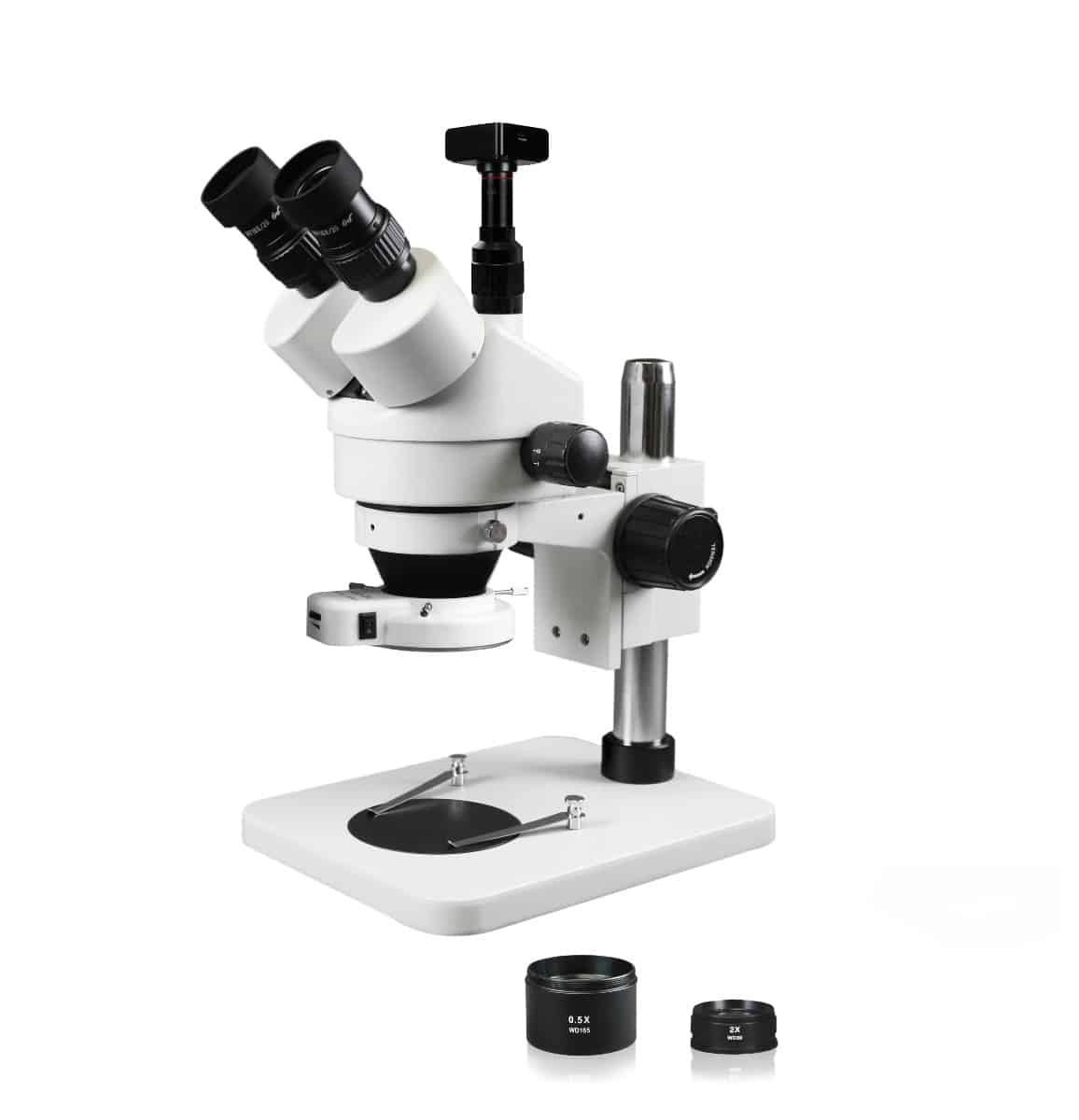 This trinocular zoom stereo microscope is ideal for laboratory, industrial or medical applications. Using its high resolution, great depth, and a large field of view, it is the perfect instrument for viewing any three-dimensional or temperature-sensitive specimen or object. Features a simul-focal trinocular head which means the photo port and both eyepieces can be used simultaneously. The compact, thin design of the large base provides added comfort for the user and allows sample positions to remain low, which provides easy accessibility to variable light controls. The pillar stand provides a long working distance, to offer maximum flexibility when working with small or large samples. Rugged cast aluminum with gray enamel finish. Packed in a fitted Styrofoam box and includes a dust cover and an instruction manual. 5-year limited warranty.