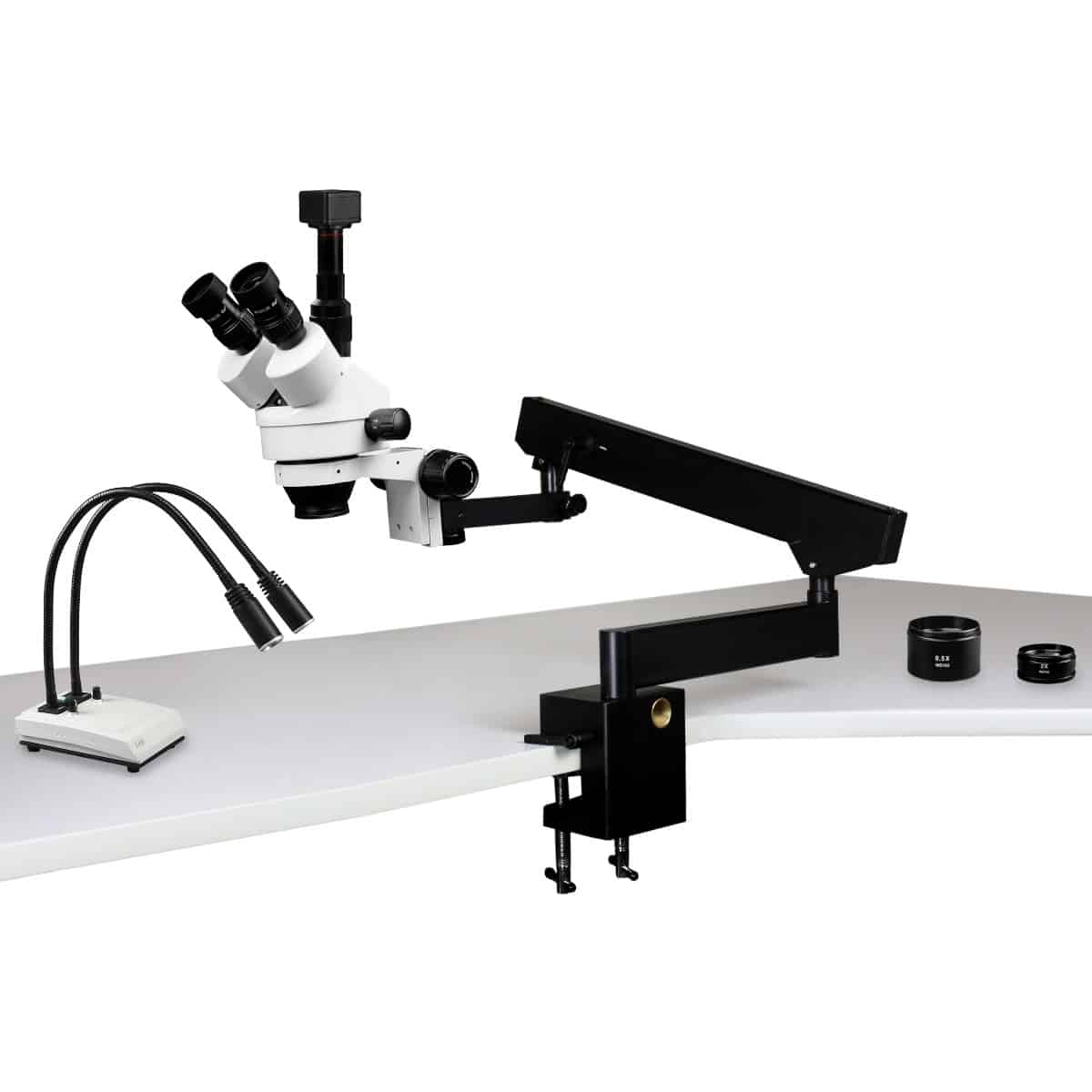 This trinocular zoom stereo microscope is ideal for laboratory and industrial applications. Using its high resolution, great depth, and a large field of view, it is the perfect instrument for viewing any three-dimensional specimen or large objects. Features a simul-focal trinocular head which means the photo port and both eyepieces can be used simultaneously. A hinged, spring-mounted arm promises versatility and provides ample space for the desired positioning over the bench-top, saving valuable work space. Each movement is individually adjusted and precisely positioned. The microscope can briefly be brought into place and returned again without difficulty. Packed in a fitted Styrofoam box, and includes a dust cover and an instruction manual. 5-year limited warranty.