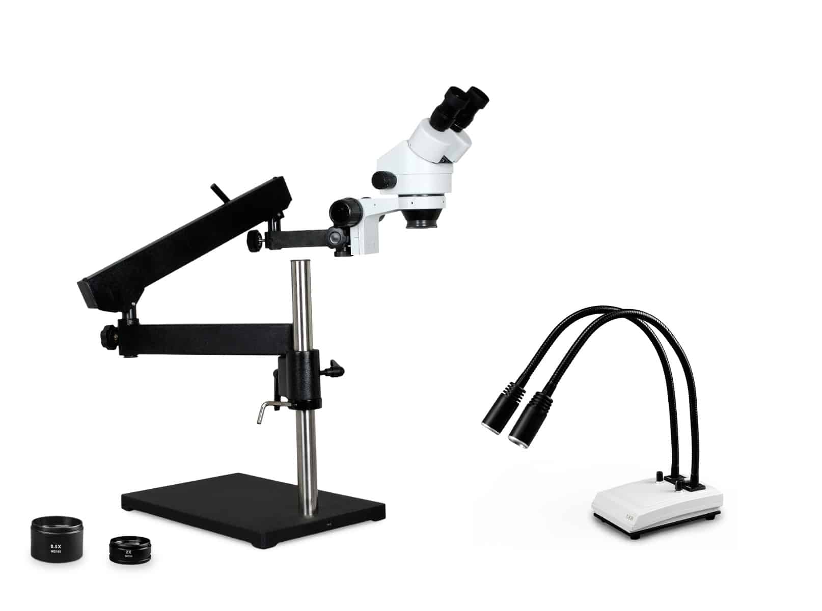 This binocular zoom stereo microscope is ideal for laboratory and industrial applications. Using its high resolution, great depth, and a large field of view, it is the perfect instrument for viewing any three-dimensional specimen or large objects. A hinged, spring-mounted arm promises versatility and provides ample space for the desired positioning over the bench-top, saving valuable work space. Each movement is individually adjusted and precisely positioned. The microscope can briefly be brought into place and returned again without difficulty. Packed in a fitted Styrofoam box, and includes a dust cover and an instruction manual. 5-year limited warranty.