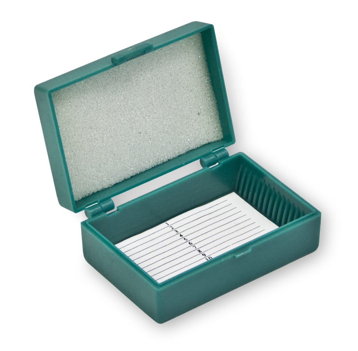 This 15 slot slide box is constructed of durable polypropylene. Hinged lid is held securely closed with a molded latched lock. Comes with index card and top foam liner to secure slides. Box will not warp in humididty and is insect-proof.