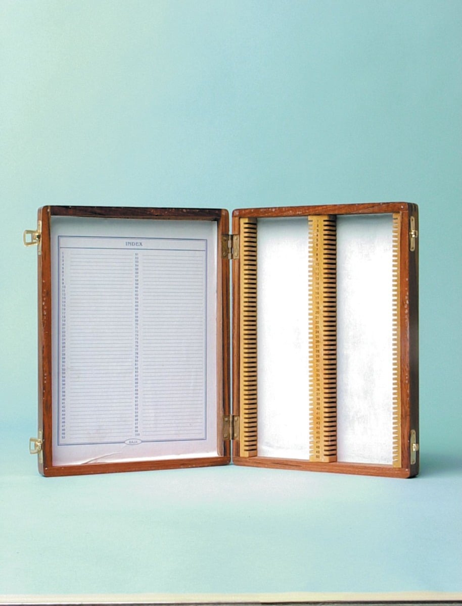 Strong wooden frame, with hinged cover. Slides fit into numbered beveled slots. Printed index lines the cover.