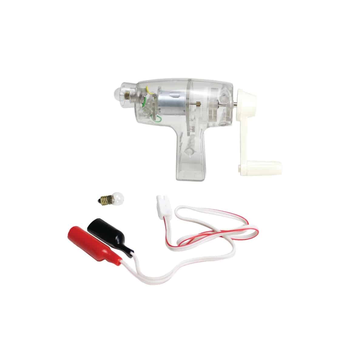 This 6V DC hand held generator can deliver up to 400mA current. The generator is equipped with a polarity coded plug-in lead with alligator clips. The clear plastic housing allows students to watch the coils, terminals, and gears. Students get a hands-on demonstration of the Second Law of Thermodynamics. Includes activity guide.