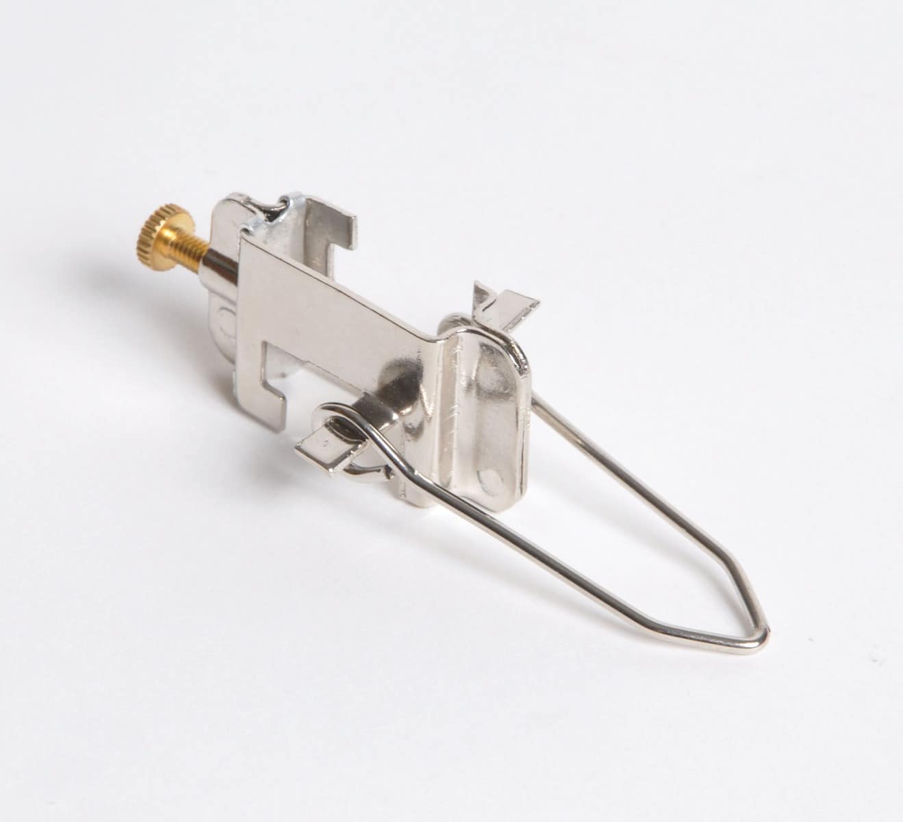 This clamp can be attached to any standard meter stick. It is used as a knife-edge fulcrum for supporting the meter stick in the inverted position.