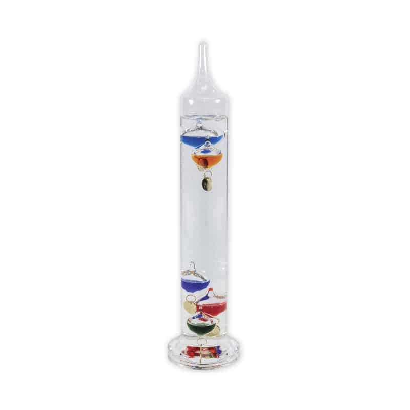 The Galileo thermometer consists of a sealed glass tube that is filled with water and several floating bubbles. The bubbles are glass spheres filled with a colored liquid. Attached to each bubble is a little metal tag that indicates the temperature (Fahrenheit) – a beautiful way to demonstrate pressure and fluid principles! Overall height is 13″. Comes with a Teacher’s Guide.