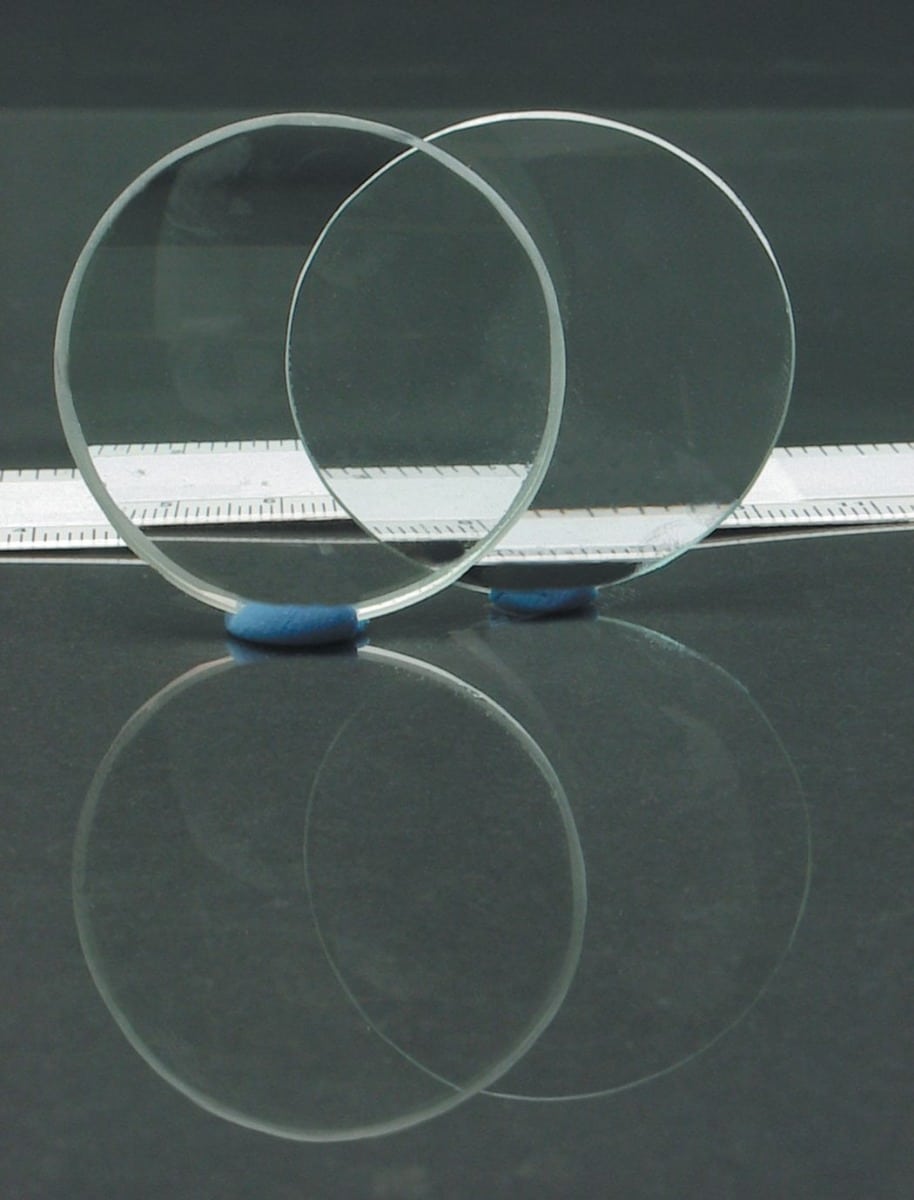 Set of two lenses, one concave and one convex, 38mm in diameter. Both lenses have a focal length of 150mm.