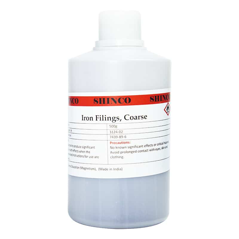 These are grease-free, fine or coarse iron filings in reusable plastic bottles. Use these filings for demonstrations and for observing magnetic fields. Sold in a 500g bottle.