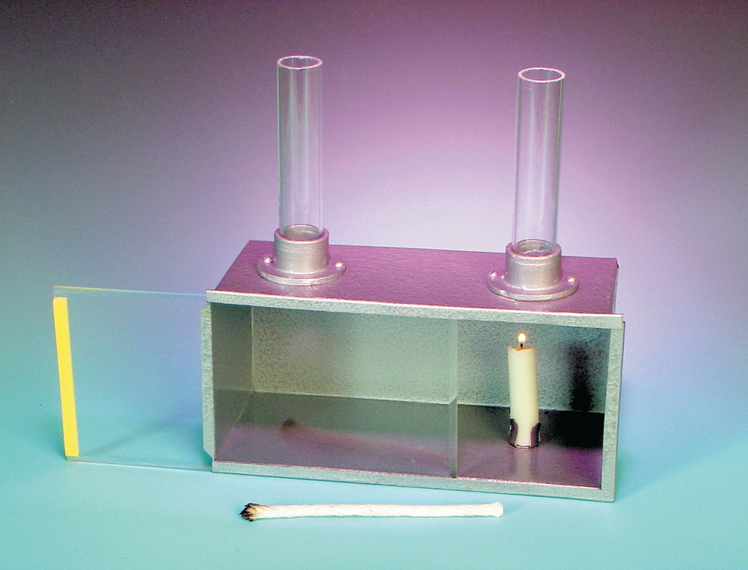 This apparatus consists of a metal box (22 x 10 x 11cm) with clear acrylic front panel, two glass chimneys, a candle, and a cotton filled wick as the smoke source. Includes activity guide.