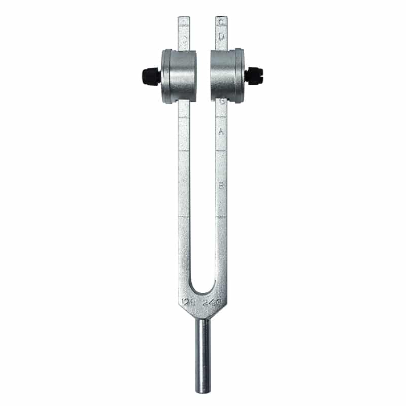 This high-quality aluminum tuning fork delivers fine tones in 7 frequencies. It is useful for demonstrating the energy and vibration of sound. Features adjustable weights for obtaining the following tones: C-128Hz, D-144Hz, E-160Hz, F-170.7Hz, G-192Hz, A-213.3Hz and B-240Hz. Scale letters are all clearly defined on stem. Fork is 8″ long.