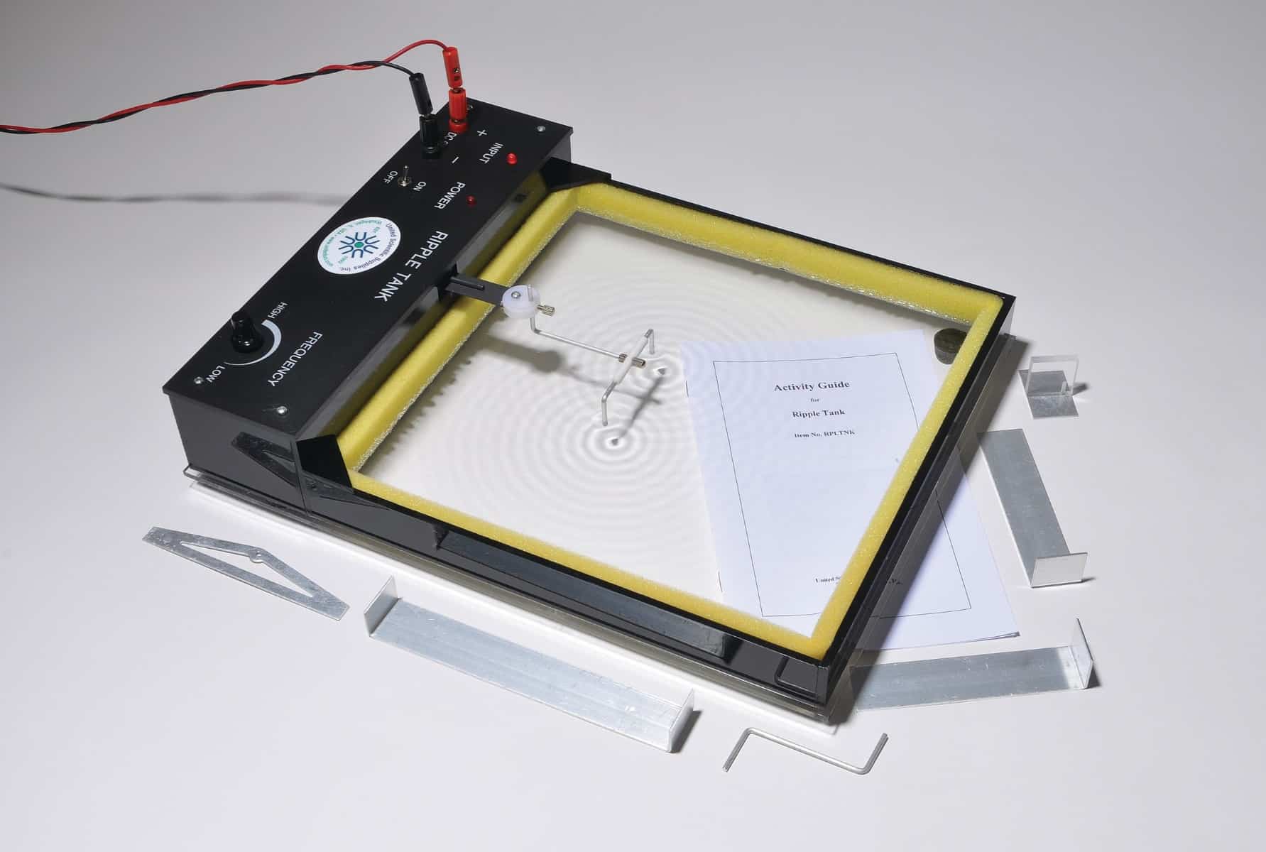 This device demonstrates the generation, propagation, reflection, interference, and diffraction of waves. It comes with all accessories necessary for these experiments. A 6V DC power source and an overhead projector are required (not included). Includes activity guide.